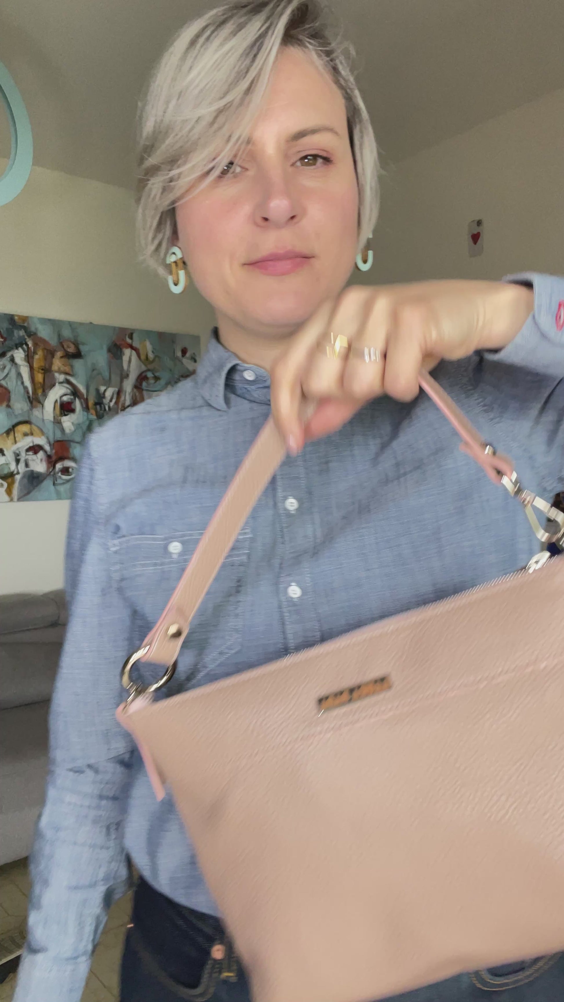 Ha una chiusura con zip e due ganci laterali in pelle con anelli a D per attaccare la tracolla 4in1 in dotazione che ti permetterà di indossarla in 4 modi diversi: a tracolla, a spalla, con manico corto e come pochette.