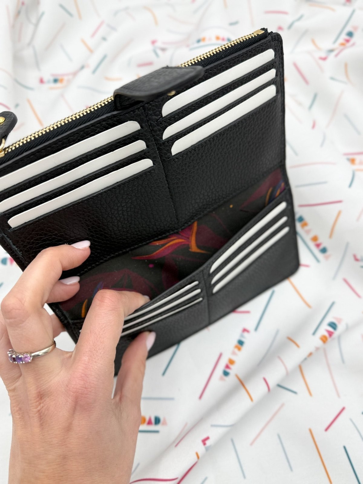 • 2 tasche aperte interne per contanti, scontrini e fogli vari
