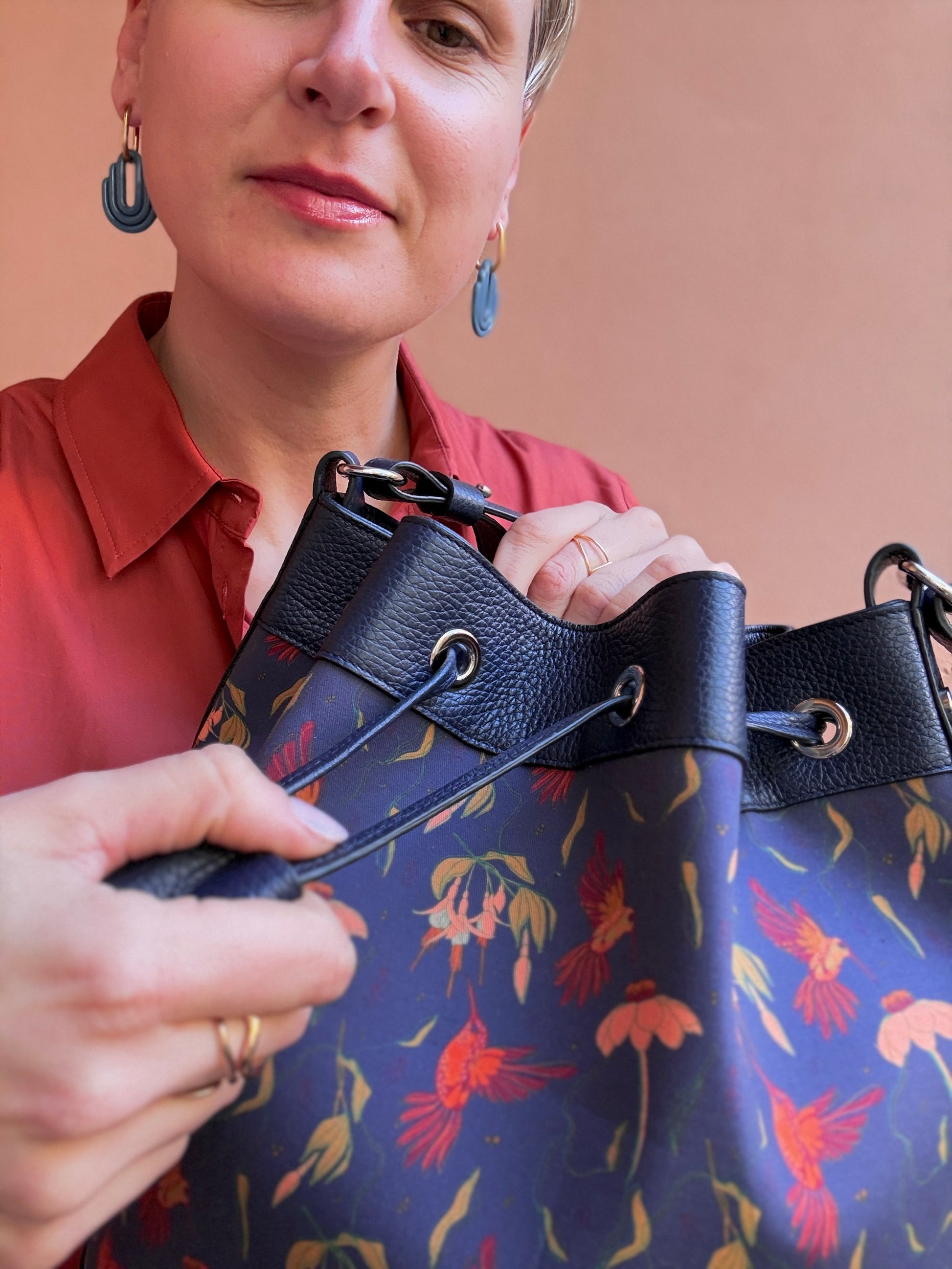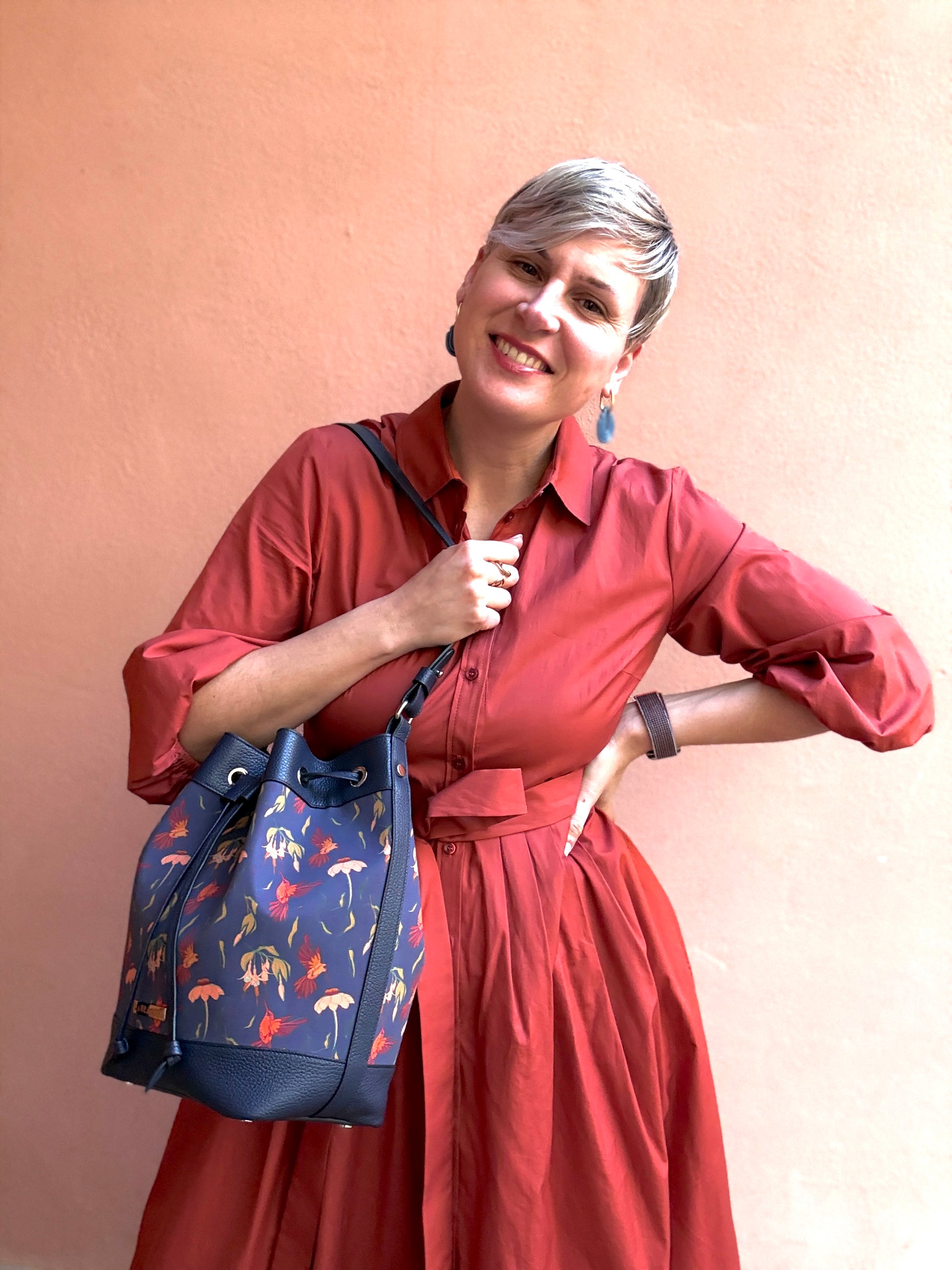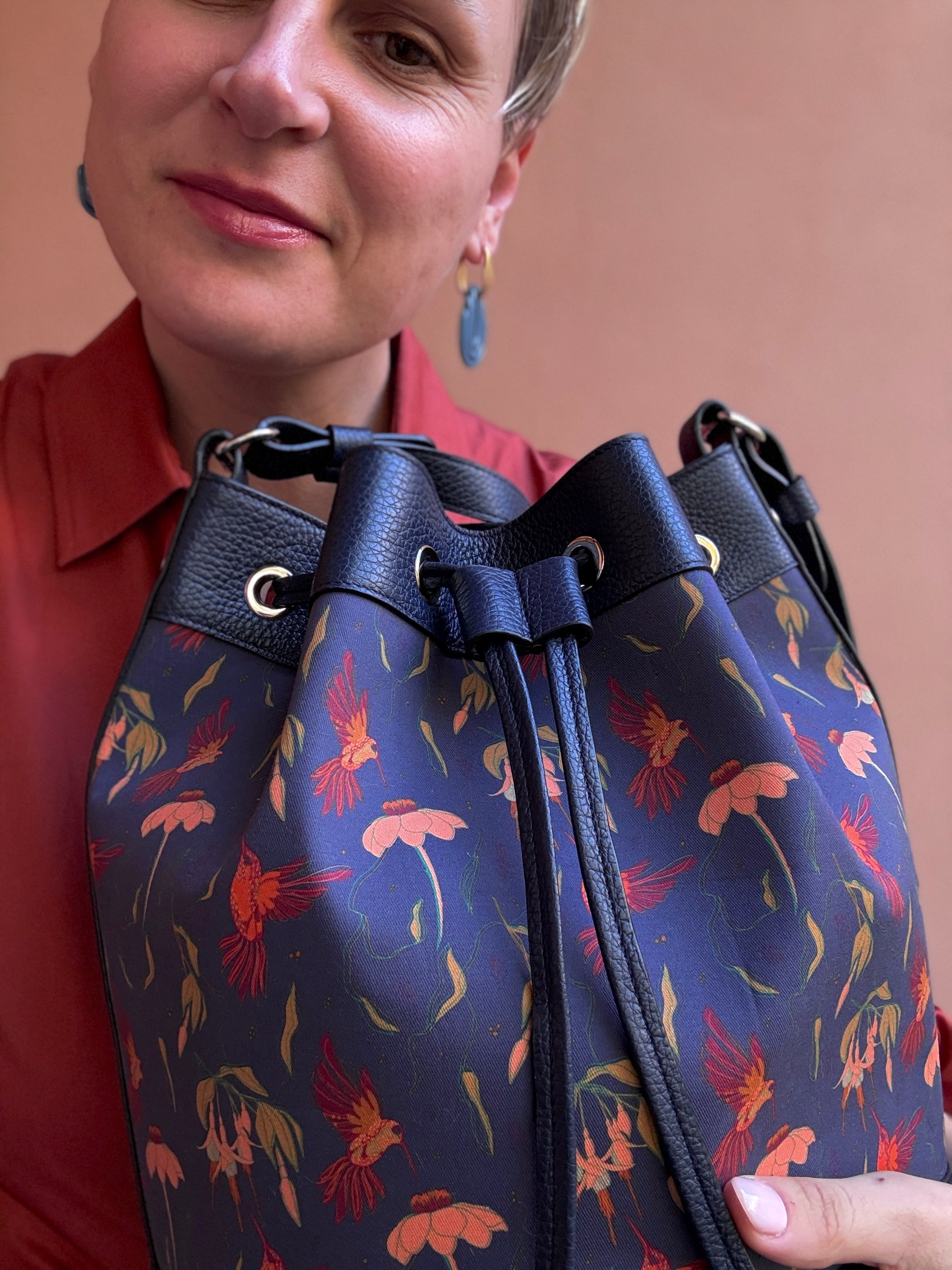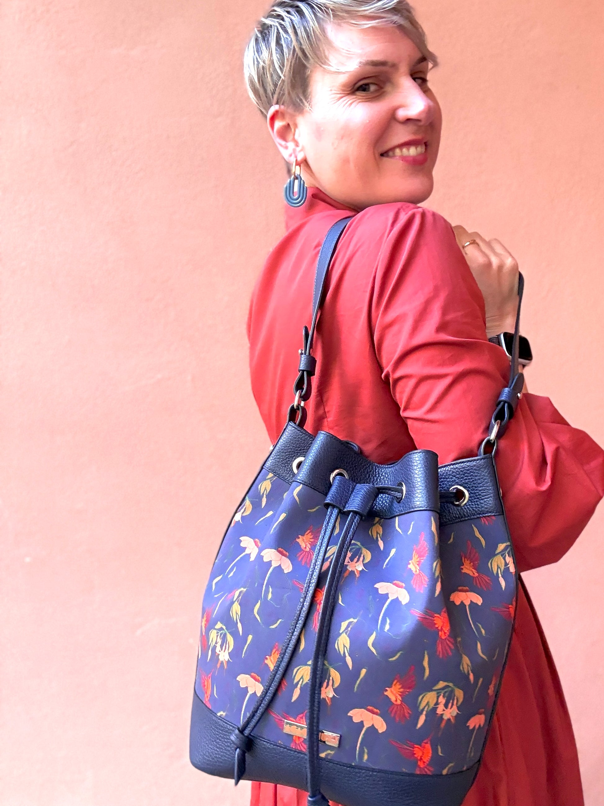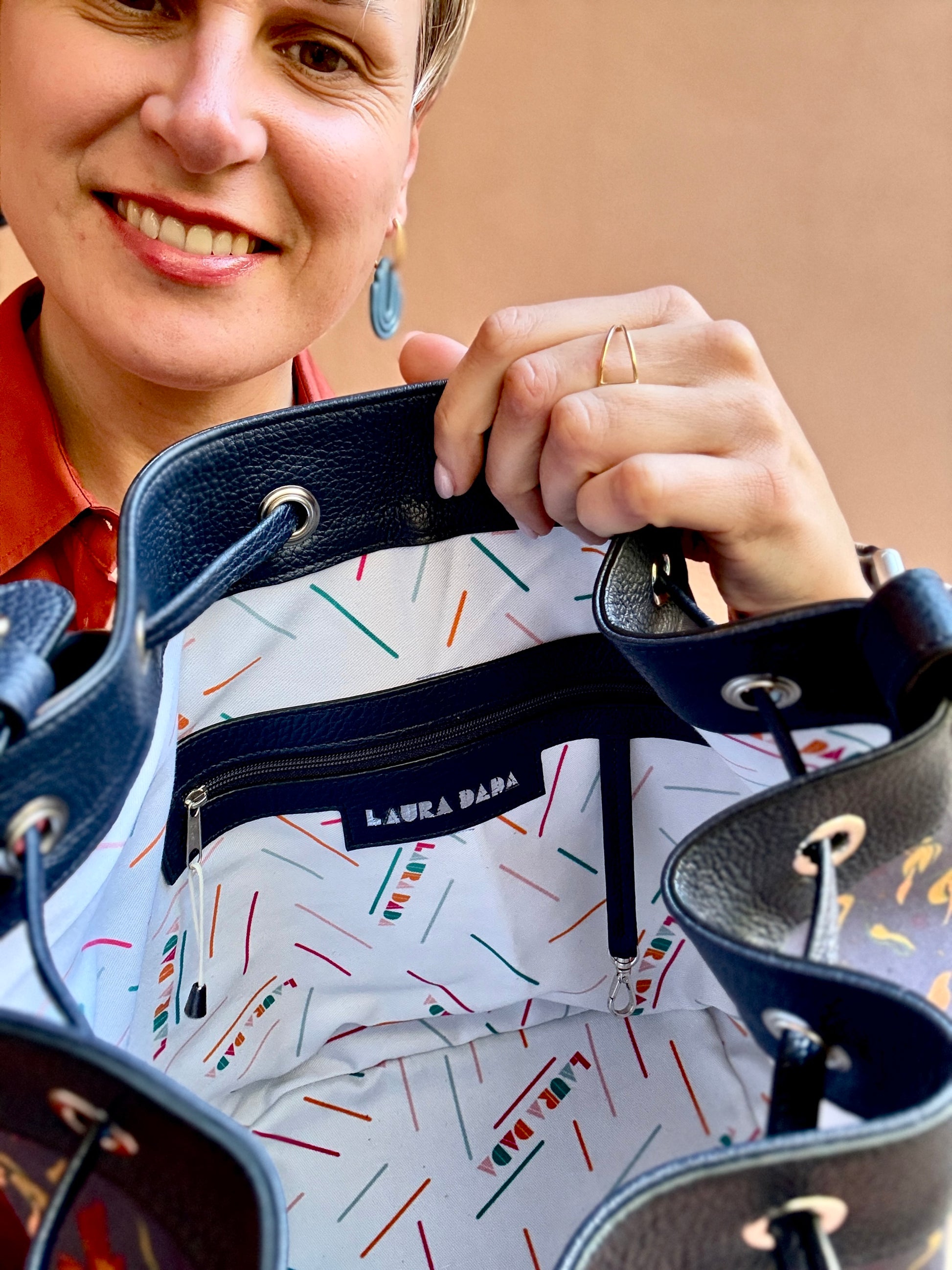 Bellissimo secchiello curato in ogni minimo dettaglio: cuciture, bordi in tinta e rivestimento interno. La pelle utilizzata è davvero super morbida e la stampa creata da Laura è davvero molto bella ed originale: sembra di indossare un quadro! Il secchiello rimane ben chiuso, non si apre e la dimensioneè perfetta anche per me che sono piccolina!