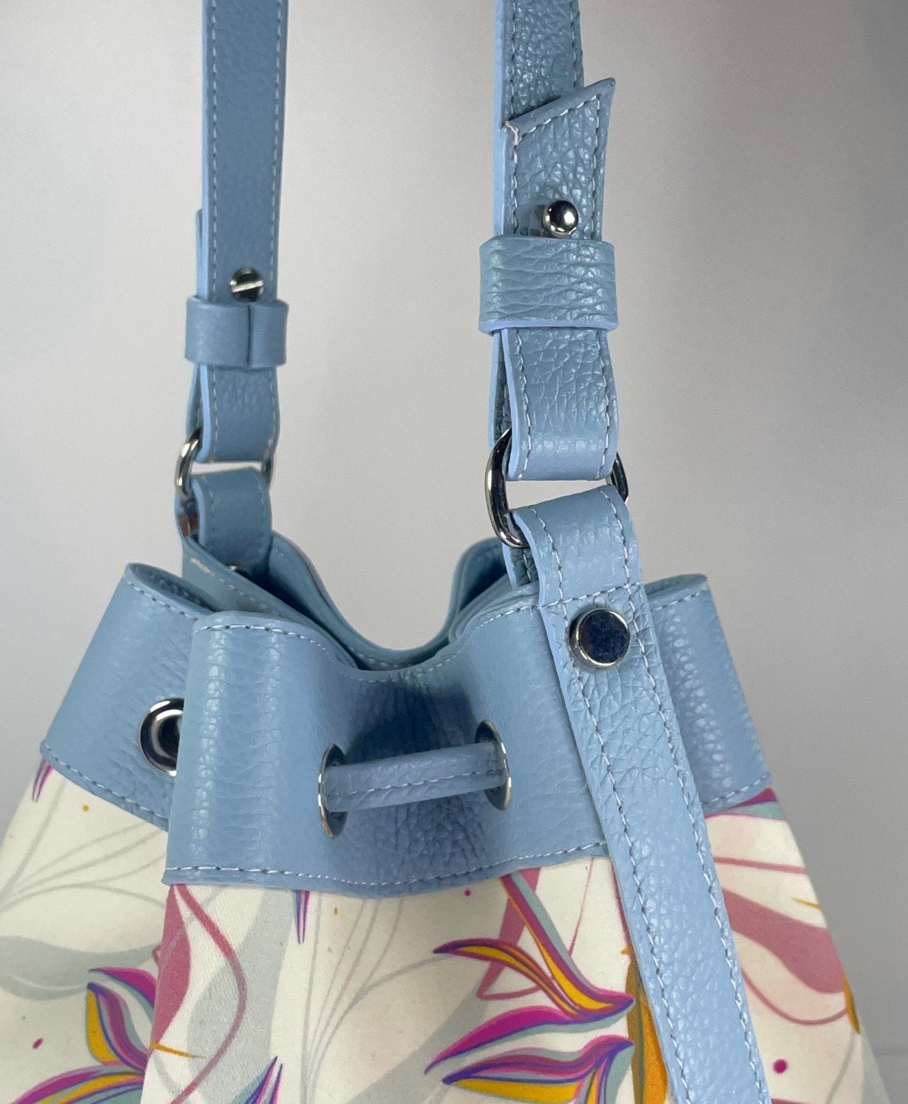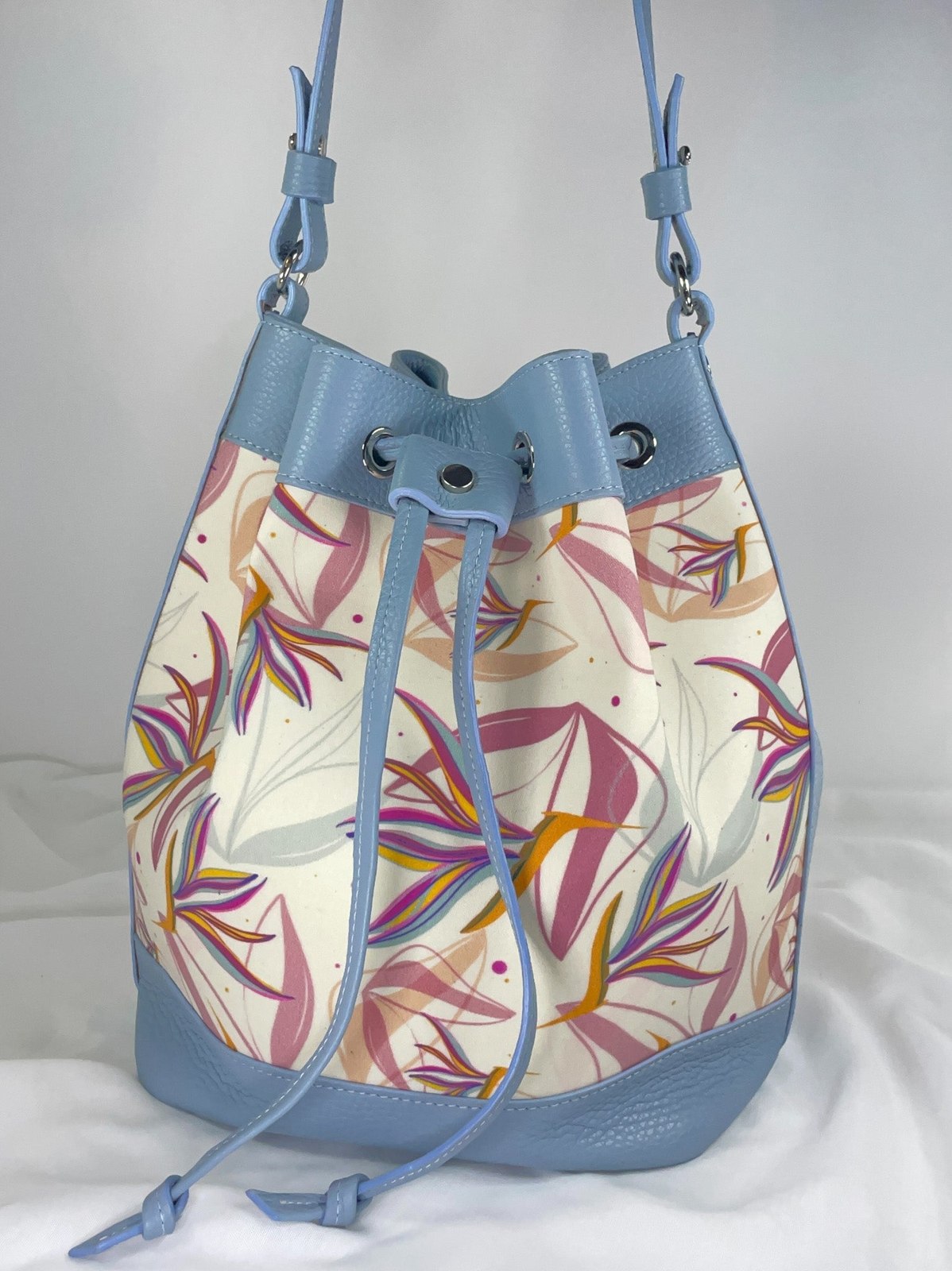 Bellissimo secchiello curato in ogni minimo dettaglio: cuciture, bordi in tinta e rivestimento interno. La pelle utilizzata è davvero super morbida e la stampa creata da Laura è davvero molto bella ed originale: sembra di indossare un quadro! Il secchiello rimane ben chiuso, non si apre e la dimensioneè perfetta anche per me che sono piccolina!