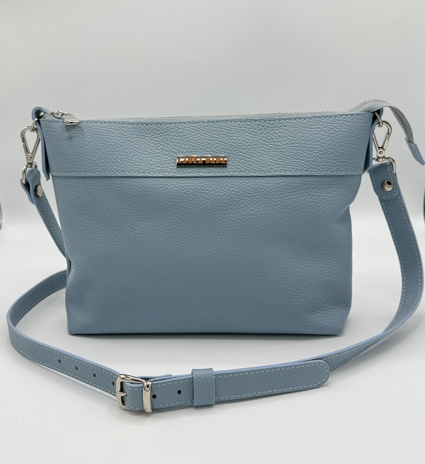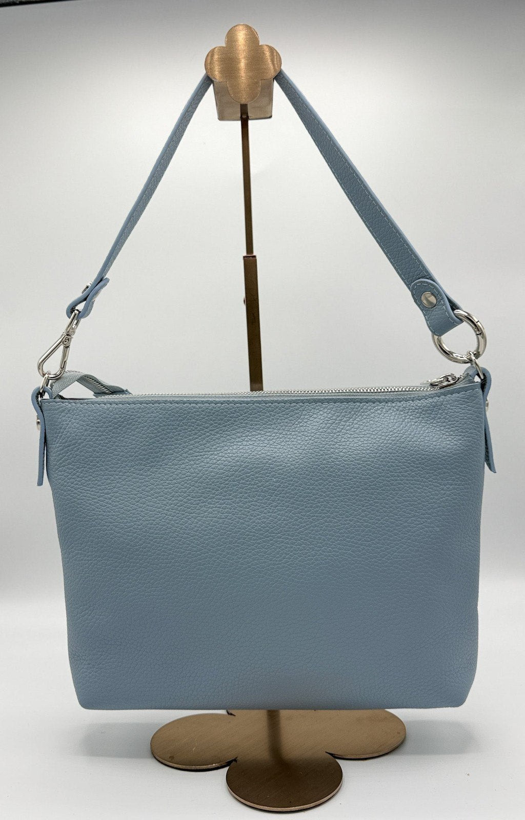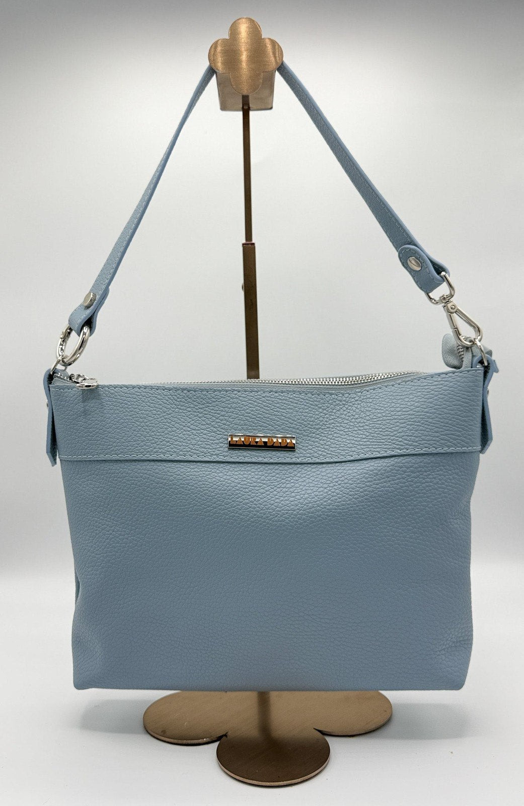 Ha una chiusura con zip e due ganci laterali in pelle con anelli a D per attaccare la tracolla 4in1 in dotazione che ti permetterà di indossarla in 4 modi diversi: a tracolla, a spalla, con manico corto e come pochette.